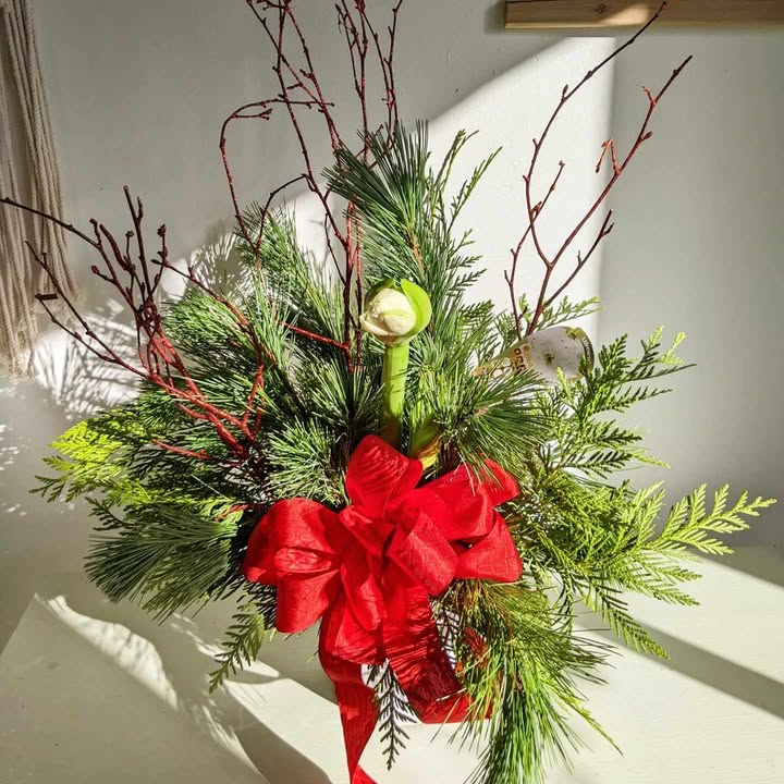 Double stemmed Amaryllis with Christmas greens, colour of Amaryllis is RANDOM.
